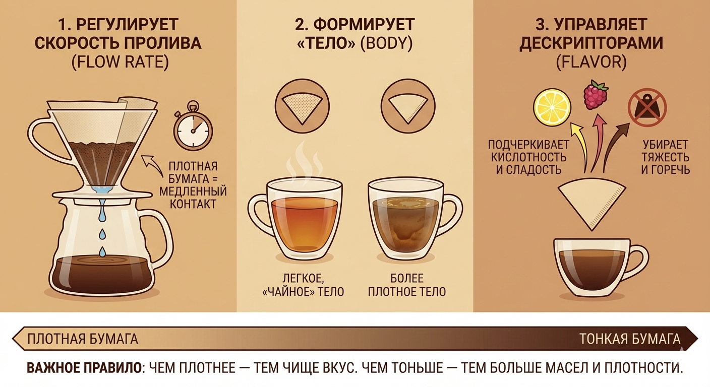 Регулирует flow rate (скорость пролива): Плотность бумаги определяет, как долго вода будет контактировать с кофе.