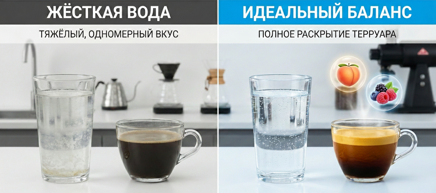 Если вода слишком жесткая (в ней много солей кальция и магния), у нее просто нет «свободного места», чтобы впитать кофейные масла. Вкус становится глухим, тяжелым и одномерным. Если же вода слишком мягкая или дистиллированная, она становится агрессивной — она вытягивает из кофе всё подряд, включая тяжелые дубильные вещества, делая напиток резким и пустым.